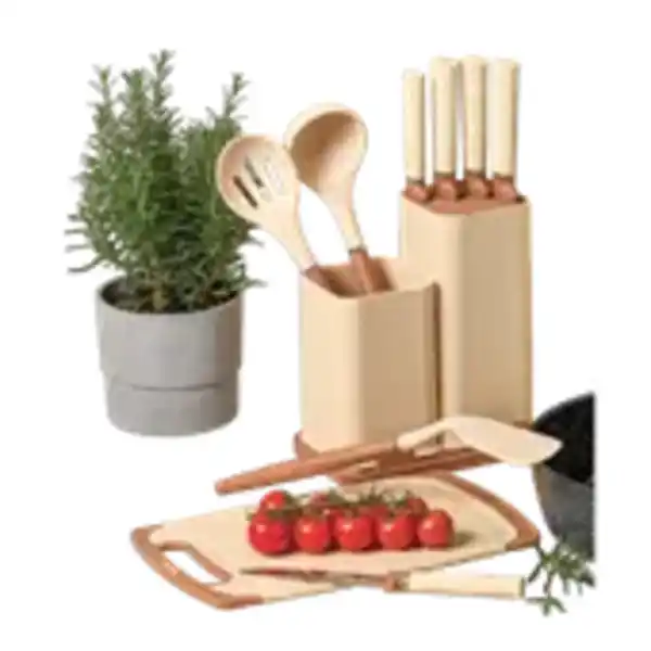 bestehend aus Brot-, Tranchier-, Koch- ,Universal- und Schälmesser, Messer-block, 3 versch. Küchenuntensilien und Schneidebrett ca. 33 x 20 cm