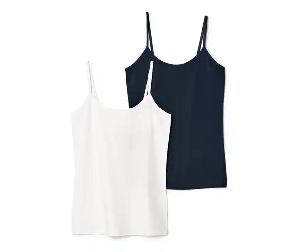 2 Hemdchen, weiß und dunkelblau Farbe: 1x weiß, 1x dunkelblau Material: 95% Baumwolle, 5% Elasthan Maße: Gesamtlänge je ca 42 cm (Gr. M 40/42) Damen-Unterhemden in weicher Baumwoll-Stretch-Qualität Mit hochwertigem Markenelasthan für Langlebigkeit und hohe Waschbeständigkeit