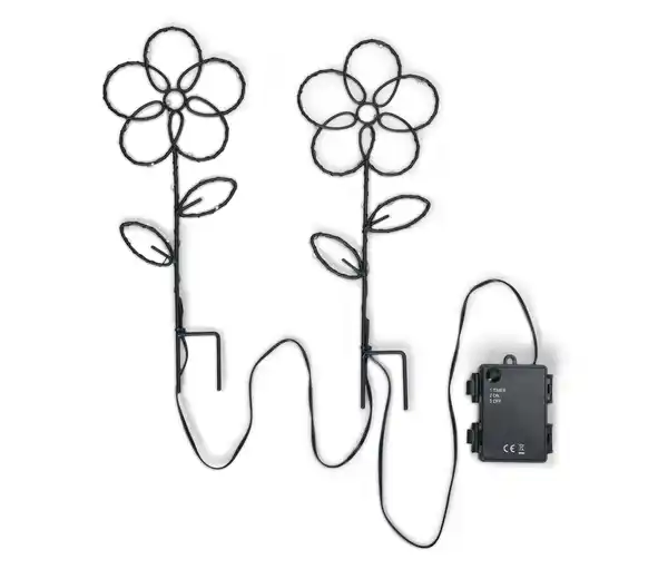 2 LED-Spieße »Blume« Farbe: Batteriefach und Spieße schwarz Material: Batteriefach Kunststoff Spieße Edelstahl, pulverbeschichtet Maße: Höhe je ca. 31 cm Ø je ca. 12 cm Länge Zuleitung und Abstand zwischen den Blumen je ca. 50 cm Inhalt: Inkl. 3 Batterien LR06 (AA) und Bedienungsanleitung Leistung: 3,6 W Batterie-/Akkulaufzeit: Leuchtdauer mit 1 Satz Batterien ca. 230 Stunden Energieeffizienz-Angaben: Lichtfarbe 2.600 K, warmweiß Fest integrierte LEDs, nicht austauschbar Informationen zur Entsorgung sowie Sammelstellen in Ihrer Nähe finden Sie unter www.tchibo.de Mit 30 Micro-LEDs – Lichtfarbe warmweißBatteriebetrieben, flexibel platzierbarMit Timerfunktion: automatisches Ausschalten nach 6 Stunden, Wiedereinschalten nach 18 StundenFür den Außenbereich geeignetSpritzwassergeschützt nach IP44