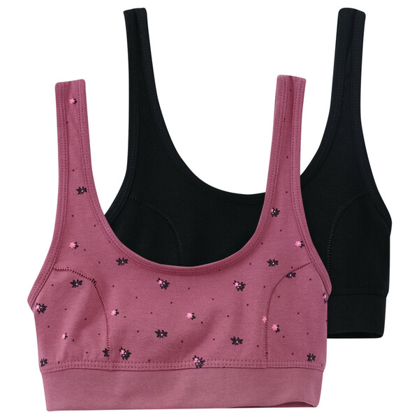 Überzeugen mit Tragekomfort! Zwei Bustiers aus hautfreundlicher Baumwolle in Beere mit dezentem Blumen-Muster und in uni Schwarz. Mit breiten Trägern und breitem Unterbrustgummi für einen guten Sitz. Ungefüttert. Cotton made in Africa setzt sich für einen ökonomisch, sozial und ökologisch nachhaltigeren Baumwollanbau in Subsahara-Afrika ein und trägt damit zu einer Verbesserung der Lebensbedingungen kleinbäuerlicher Familien bei.