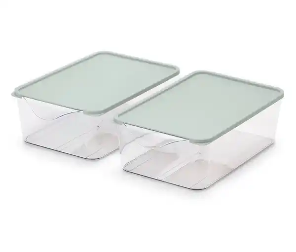 2 Ordnungskörbe Farbe: Boxen transparent Deckel graugrün Material: Boxen 100% Styrol-Acrylnitril-Copolymer Deckel 100% Polypropylen Maße: B x H x T je ca. 27,4 x 8,3 x 16,4 cm Höhe gestapelt ca. 16,1 cm Tragkraft: Je max.1 kg StapelbarBequeme Aufbewahrung und schnelles Erreichen – auch Lebensmittel in der hinteren Ecke werden problemlos erreicht, einfach herausziehenTransparentes Design – Inhalte direkt ersichtlichLebensmittelecht und spülmaschinengeeignetInkl. 2 Deckeln