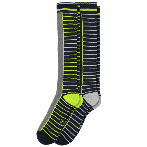 Die halten schön warm! Zwei Paar Kniestrümpfe in Dunkelblau und Grau meliert im sportlich-gestreiften Design. Elastische Bündchen für einen guten Sitz. Wärmende Frottee-Qualität.
