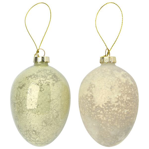 Blickfang an jedem Oster-Strauch! Zweierpack große Deko-Eier im matten und glänzenden Creme und in gesprenkelter Optik. Mit goldfarbener Schlaufe zum Aufhängen. Maße ca. 11 x 7,5 cm (HxØ).
