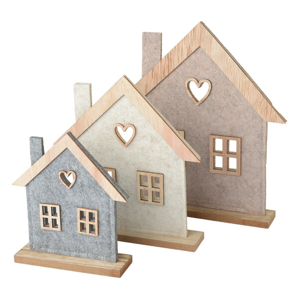 Verliebt in Zuhause! Drei Dekoaufsteller aus Filz in Beige, Weiß und Grau. In Haus-Form mit Holzfuß und verschiedenen Holz-Details. Beige ca. 23 x 4 x 26 cm, Weiß ca. 19 x 4 x 21 cm, Grau ca. 14 x 4 x 16 cm (BxTxH).