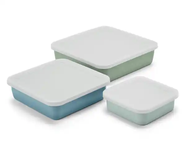 3 Emaille-Auflaufformen mit Deckel Farbe: 1x graugrün, 1x salbeigrün, 1x blau Deckel milchig-transparent Material: Emaillierter Stahl Deckel 100% Polyethylen Maße: B x H x T groß ca. 24 x 7 x 24 cm B x H x T mittel ca. 20 x 6 x 20 cm B x H x T klein ca. 14 x 5 x 14 cm Inhalt: Inkl. Deckeln und Gebrauchsanweisung Gebrauchsanweisung: Auflaufform hitzebeständig bis 400 °C Deckel temperaturbeständig von –20 °C bis +80 °C Ideal zum Zubereiten, Aufbewahren und Servieren von süßen oder herzhaften SpeisenAus ofenfestem, 3-fach emailliertem Metall – für hohe KorrosionsbeständigkeitHygienisches Verarbeiten von Lebensmitteln durch bakterien- und schmutzabweisende OberflächeGeschmacks- und geruchsneutral sowie resistent gegen FruchtsäureAuflaufformen ohne Deckel hitzebeständig bis 400 °CIneinander stapelbar und patzsparend verstaubar