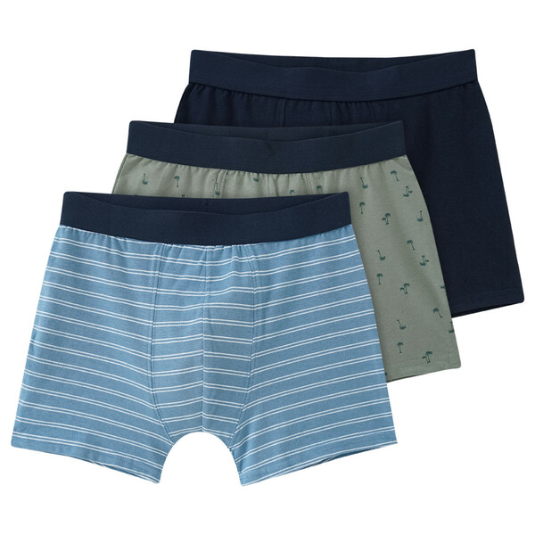 Cooles Dreiergespann Drei Boxer in Helloliv mit Palmen-Allover, in unifarben Dunkelblau und in Blau mit feinen weißen Streifen allover. Jeweils mit elastischem Webbund. Im Schritt doppellagig gearbeitet. Cotton made in Africa setzt sich für einen ökonomisch, sozial und ökologisch nachhaltigeren Baumwollanbau in Subsahara-Afrika ein und trägt damit zu einer Verbesserung der Lebensbedingungen kleinbäuerlicher Familien bei.