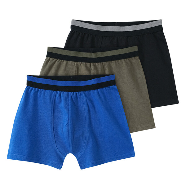 Beste Basics! Drei Boxer in uni Blau, Grün und Schwarz. Jeweils mit zweifarbigem, elastischem Webbund. Im Schritt doppellagig gearbeitet. Cotton made in Africa setzt sich für einen ökonomisch, sozial und ökologisch nachhaltigeren Baumwollanbau in Subsahara-Afrika ein und trägt damit zu einer Verbesserung der Lebensbedingungen kleinbäuerlicher Familien bei.