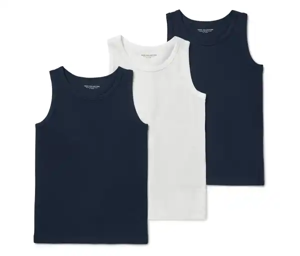 3 Kinder-Unterhemden Farbe: 2x dunkelblau, 1x weiß Material: 95% Baumwolle (aus ökologischem Anbau), 5% Elasthan Sonstige Hinweise: Größenlauf/Alter: Gr. 122/128 (ca. 6 – 8 J.) Gr. 134/140 (ca. 8 – 10 J.) Gr. 146/152 (ca. 10 – 12 J.) Gr. 158/164 (ca. 12 – 14 J.) Gr. 170/176 (ca. 14 – 16 J.) Weiche Single-Jersey-QualitätGerader, schmaler SchnittFeine RippeGOTS organic, zertifiziert durch CU 809415