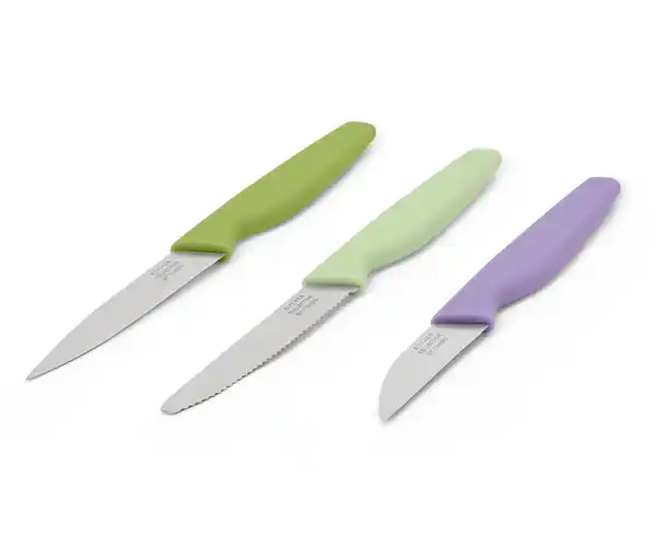 3 Küchenmesser Farbe: Allzweckmesser Glattschliff mintgrün Allzweckmesser Wellenschliff hellgrün Schälmesser flieder Material: Klingen Edelstahl Griffe 100% Polypropylen Maße: L x B x H Allzweckmesser Glattschliff ca. 20 x 2 x 1 cm L x B x H Schälmesser ca. 17 x 2 x 1 cm L x B x H Allzweckmesser Wellenschliff ca. 20,5 x 2 x 1 cm Inhalt: Gebrauchsanweisung online abrufbar Für jede Anwendung das passende Messer3 Messer für unterschiedliche Anwendungen: Schälmesser, Allzweckmesser und TomatenmesserHandliches Schälmesser mit kurzer Klinge und GlattschliffAllzweckmesser mit spitzer Klinge und GlattschliffAllzweckmesser mit feinem Wellenschliff - ideal zum Schneiden von weichem Obst und Gemüse wie Tomaten oder als Frühstücksmesser