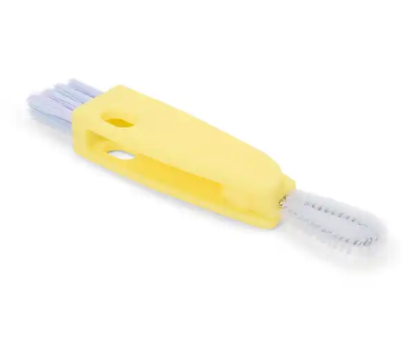 3-in-1-Reinigungsbürste Farbe: Griff gelb Borsten flieder Material: Korpus 72% Polypropylen (recycelt), 28% Polypropylen Gedrehte Borsten 100% Polyamid Borsten Frontbürste 100% Polybutylen-Terephthalat Draht Stahl Maße: Länge ca. 13,5 cm Gebrauchsanweisung: Spülmaschinengeeignet Sonstige Hinweise: designed by: MARNA INC. / www.marna.jp Ideal zur Reinigung von Zwischenräumen Schmaler Schaber für schwer erreichbare StellenBesonders geeignet für Deckel, Dichtungen, Tastaturen und ArmaturenDrahtbürste zum Beseitigen von hartnäckigem Schmutz Flexible Borsten zum Entfernen von Krümeln und Staub Mit recyceltem Material