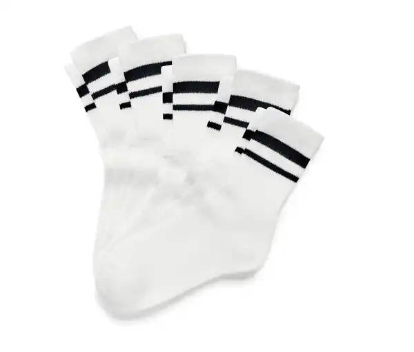 5 Paar Kinder-Tennissocken Farbe: 5x weiß mit schwarzen Streifen Material: 85% Baumwolle (aus ökologischem Anbau), 13% Polyamid, 2% Elasthan (Creora®) Hoher Tragekomfort durch weiche TerrysohleExtraflache ZehennahtVerstärkte Spitze und FerseMit Elasthan: formbeständig, perfekter Sitz, hoher Tragekomfort Weiche Qualität mit hohem BaumwollanteilDiese 5 Paar Socken schützen Wasserressourcen.