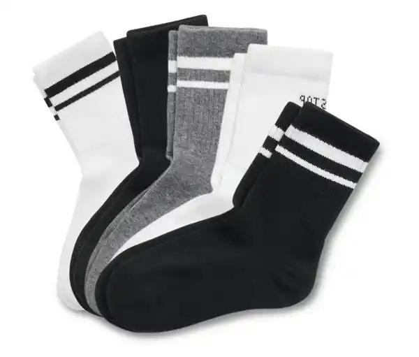 5 Paar Kinder-Tennissocken, grau Farbe: 1x schwarz mit 2 weißen Ringeln, 1x schwarz mit weißem Schriftzug, 1x grau meliert mit 2 weißen Ringeln, 1x weiß mit schwarzem Schriftzug, 1x weiß mit 2 schwarzen Ringeln Material: 85% Baumwolle, 13% Polyamid, 2% Elasthan (Creora®) Hoher Tragekomfort durch weiche TerrysohleMit Elasthan: formbeständig, perfekter Sitz, hoher Tragekomfort Extraflache ZehennahtVerstärkte Spitze und FerseWeiche Qualität mit hohem Baumwollanteil