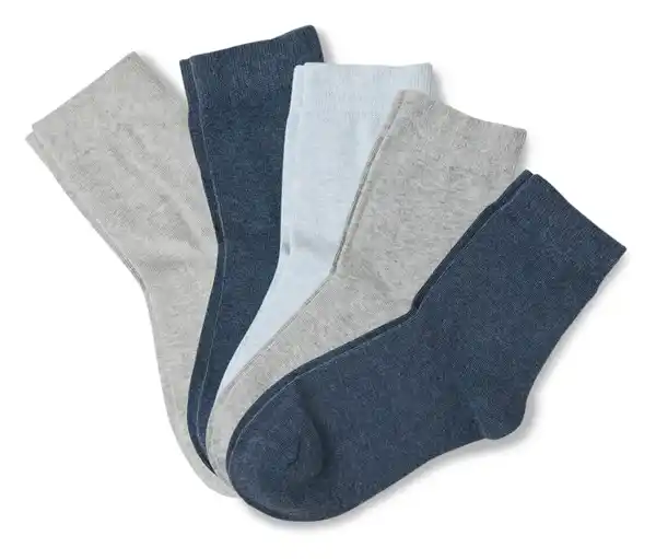 5 Paar Socken Farbe: 2x grau meliert, 2x dunkelblau meliert, 1x hellblau meliert Material: 75% Baumwolle, 23% Polyamid, 2% Elasthan (Creora®) Weiche Qualität mit Bio-BaumwolleKomfortbund – kein Einschnüren Extraflache Zehennaht Verstärkte Spitze und Ferse Mit Elasthan: formbeständig, perfekter Sitz, hoher Tragekomfort