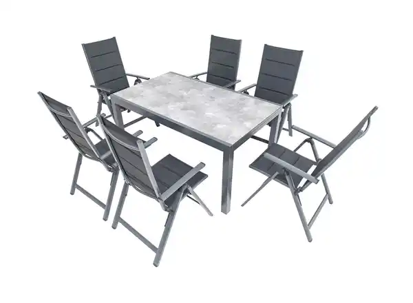 Eleganz und Funktionalität für Ihren Außenbereich – Alu - Dining - Set GRANADA, 7tlg., ca. 150/250 x 90 x 75 cm Verleihen Sie Ihrem Garten, Ihrer Terrasse oder Ihrem Balkon einen modernen und stilvollen Look Dieses hochwertige Set aus Aluminium vereint Funktionalität, Komfort und Design Der ausziehbare Glastisch ist flexibel einstellbar für kleine oder große Runden Sicherheitsverschluss unter dem Tisch für Stabilität und Schutz Der Aluminiumrahmen mit Pulverbeschichtung ist ideal für den Außenbereich Die Kombination aus Glas, Aluminium und schwarzem Textilene-Gewebe verleiht Ihrem Außenbereich einen modernen Touch Die komfortablen Klappstühle bieten eine mehrstufig verstellbare Rückenlehne Maße (BxTxH) Sessel (BxTxH): ca. 57 x 68 x 110 cm Tisch (BxTxH): ca. 150/250 x 90 x 75 cmDie angegebenen Maße sind ungefähre Angaben und können leicht abweichen.Hinweis Bitte beachten Sie, dass aufgrund von unterschiedlichen Bildschirmeinstellungen, Sonneneinstrahlung während der Fotografie und anderen Lichtverhältnissen die tatsächliche Farbe des Produkts von den Bildern abweichen kann.Lieferumfang 1 Karton mit Tisch 3 Kartons mit je 2 Stühlen