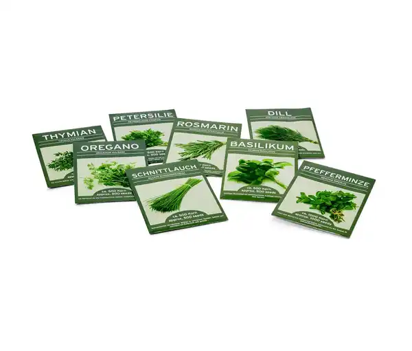 8 Kräuterklassiker Material: Basilikum Genovese, Dill, Pfefferminze, Oregano, Petersilie Gigante d'Italia, Rosmarin, Schnittlauch mittelgrobröhrig, Thymian Inhalt: Inkl. Aussaat-Anleitung Füllmenge: Füllmenge Basilikum ca. 0,8 g (ca. 500 Körner), Dill ca. 1,4 g (ca. 1.000 Körner), Pfefferminze ca. 0,1 g (ca. 1.000 Körner), Oregano ca. 0,1 g (ca. 500 Körner), Petersielie ca. 1 g (ca. 500 Körner), Rosmarin ca. 0,1 g (ca. 100 Körner), Schnittlauch ca. 0,6 g (ca. 500 Körner), Thymian ca. 0,2 g (ca. 500 Körner) Sonstige Hinweise: Basilikum Genovese / Basil Aussaat: Ab Mitte Mai bis Mitte Juni im Freiland an Ort und Stelle. Im Haus ganzjährige Aussaat möglich. Saattiefe ca. 0,5-1 cm. Keimung: Keimung ca. 6 bis 10 Tage nach der Aussaat ab einer Bodentemperatur von 15 °C. Immer feucht halten. Kultur: Reihenabstand 20-30 cm, in der Reihe 20-25 cm. Bei Bedarf auf Abstand verziehen. Standort: Sonnig, warm und geschützt. Sandiglehmiger und humoser Boden. Geringer Nährstoffbedarf. Ernte/Verwendung: Wichtiger Bestandteil der Mittelmeerküche. Kräftiges Universalgewürz für viele Speisen. Dill / Dill Aussaat: Ab Anfang April bis Ende August direkt an Ort und Stelle. Saatgut leicht bedecken. Saattiefe ca. 0,5-1 cm. Keimung: Sehr ungleichmäßig. Daher ist die Aussaat in Sätzen und an verschiedenen Stellen im Garten empfehlenswert. Kultur: Reihenabstand 25 cm, in der Reihe 15 cm. Bei Bedarf auf Abstand verziehen. Standort: Sonnig bis halbschattig. Ansonsten normaler Gartenboden. Schwachzehrer. Ernte/Verwendung: Zum Würzen von Essig, Salaten, Soßen, Fisch. Samen und Blätter auch zum Einlegen von Gurken. Pfefferminze / Peppermint Aussaat: Ab März ins Frühbeet, ab April ins Freiland. Pfefferminze ist ein Lichtkeimer, daher das Saatgut nicht mit Erde bedecken. Keimung: Keimdauer ca. 2 Wochen bei einer optimalen Temperatur von 20 °C. Kultur: Reihenabstand ca. 25-30 cm, in der Reihe nach 30 Tagen auf ca. 25 cm vereinzeln. Standort: Anspruchslos. Leichte Volldüngergabe und Kompostzugabe vor dem Säen und nach dem Vereinzeln sind ausreichend. Ernte/Verwendung: Frisch zum Würzen von Speisen und Soßen. Getrocknet als Tee, Aufguß, Öl und als Einreibemittel. Oregano / oregano Aussaat:Ab Mitte März im Freiland. Im Haus ganzjährige Aussaat möglich. Oregano ist ein Lichtkeimer, daher das Saatgut nicht mit Erde bedecken. Keimung: Keimdauer ca. 6-10 Tage nach der Aussaat bei einer Temperatur von 12-16 °C. Benötigt viel Licht. Kultur: Dünn verteilt im Reihenabstand von 25-30cm. In der Reihe vereinzeln auf 2-3 Sämlinge im Abstand von 25 cm. Standort: Sonnig und warmer Standort, gut durchlässiger Gartenboden. Bevorzugt lehmig. Ernte/Verwendung: Als Würzkraut für alle Fleischgerichte, Suppen, vegetarische Brotaufstriche. Petersilie Gigante d'Italia / garden parsley Aussaat: Ab März bis September breitwürfig oder in Reihen an Ort und Stelle. Saatgut nur leicht bedecken. Saattiefe ca. 0,5-1cm. Keimung: Petersilie keimt ungleichmäßig nach 2-4 Wochen. Das Saatbeet zur Keimung immer feucht halten und im Sommer möglichst beschatten. Standort: An der Saatstelle sollte der Boden vorher tiefgründig gelockert werden, um spätere Staunässe zu verhindern, ansonsten anspruchslos. Ernte/Verwendung: Sehr vielseitig verwendbar, zum Würzen von fast allen europäischen Gerichten. Hoher Vitamin A, B und C Gehalt, mineralstoffhaltig. Rosmarin / Rosmary Aussaat: Ab Februar ins Frühbeet, ab April ins Freiland. Saatgut nur leicht mit Erde bedecken. Keimung: Keimt unregelmäßig. Keimdauer ca. 10-14 Tage bei ca. 22 °C. Kultur: Reihenabstand ca. 25-30 cm, in der Reihe 20 cm vereinzeln. Standort: Sonnige Lage, nährstoffreiche Erde. Im Winter die Pflanzen ausgraben und im Haus überwintern, da frostempfindlich. Ernte/Verwendung: Beliebtes Gewürz zu allen Fleischarten, Tomaten und Pilzgerichten. Frisch oder im Schatten getrocknet verwendbar. Schnittlauch mittelgrobröhrig / Chive Aussaat: Frühsaaten im Haus ab Februar bis April, Freilandsaat ab April bis Anfang August. Saatgut nur leicht mit Erde bedecken. Keimung: Keimt recht zügig. Das Saatgut und später auch die Pflanze immer feucht halten. Kultur: Reihenabstand 20 cm, in der Reihe 15 cm. Standort: Sonnig bis halbschattig. Ansonsten normaler Gartenboden. Mittelhoher Düngerbedarf. Ernte/Verwendung: Schmackhaftes Würzgemüse, Beilage zu zahlreichen Speisen, Salaten und vorzüglich auf Butterbrot, sehr gesund. Thymian / Thyme Aussaat: Frühsaaten im Haus ab Februar bis April, Freilandsaat ab April bis Anfang August. Saattiefe 0,5 cm. Keimung: Keimung nach 14-25 Tage bei 15-20 °C. Einmal pikieren und dann auspflanzen. Kultur: Reihenabstand 20 cm, in der Reihe 15 cm. Rückschnitt im Spätherbst oder Frühjahr. Standort: Vollsonnig, geschützt, warm. Normaler Gartenboden, Lehm und Kalk vorteilhaft. Ernte/Verwendung: Die frischen Blätter zum Würzen von Fleisch-, Geflügel und Fischgerichten. Getrocknete Blätter als Tee. MHD 01/2028/Best before 01/2028 Standard-Saatgut EU-Norm/EU standard seeds Reg.-Nr. des Abfüllers: DE-NI-296444 Abfülljahr WJ 2024 Ideal für Balkon, Garten oder KücheEnthält 8 Kräuter einzeln verpackt: Basilikum, Dill, Pfefferminze, Oregano, Petersilie Gigante dÌtalia, Rosmarin, Schnittlauch mittelgrobröhrig, ThymianDie Klassiker der KüchenkräuterBotanische Bezeichnungen: Anethum graveolens, Mentha piperita, Origanum vulgare, Petroselinum crispum, Rosmarinus officinalis, Allium schoenoprasum, Thymus vulgaris