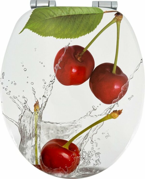 Sehr stabiler Holzkern WC Sitz mit Kirschen Motiv und Absenkautomatik! Sie suchen einen neuen Blickfang für Ihr Bad/Ihre Toilette? Hier ist er! Dieser sehr schöne Motiv WC Sitz ist mit einer Absenkautomatik ausgestattet. Diese sorgt für für leises und sanftes Schliessen von Deckel und Ring, Sie müssen diese nur antippen. Die Montage ist einfach, sämtliches Montagematerial liegt bei. Der WC Sitz wird klassisch von unterhalb der Keramik verschraubt, für besten Halt. Die Metall Scharniere sind verstellbar, daher ist der WC Sitz universal passend auf alle gängigen Standard WC Keramiken. Sie werden zufrieden sein. ADOB, Ihr Partner für Bad und WC seit 1920 aus Deutschland.