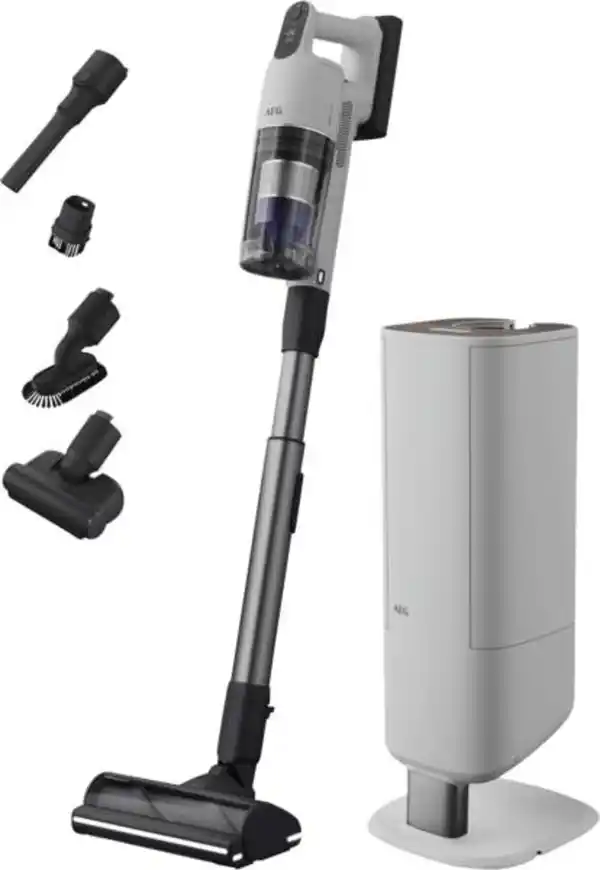 Akku-Stielsauger, abnehmbarer Handsauger, Beleuchtung an der Bodendüse, LCD-Display, elektronische Saugkraftregulierung, 4 Leistungsstufen, bis zu 80 Minuten Betriebszeit, Li-Ionen-Akkusystem, 21,6 Volt, Universal-Bodendüse, Elektrobürste, Fugendüse, Ladestation mit Absaugeinheit, Möbelpinsel, Teleskoprohr, Produkt enthält recyceltes Material