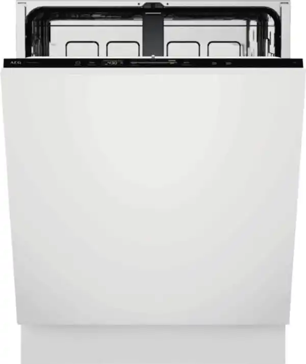 Einbau-Geschirrspüler, vollintegrierbar, 8 Spülprogramme, 4 Temperaturen, Startzeitvorwahl, LED-Display, Restzeitanzeige, Oberkorb höhenverstellbar, SoftSpikes im Oberkorb (sicherer Halt für Gläser jeglicher Größe), Besteckschublade, AirDry Technologie (automatische Türöffnung nach Programmende), Inverter-Motor (bürstenlos, langlebig, zuverlässig und leise), Aquacontrol - Wasserstop, Warmwasseranschluß, Steuerung über MyAEG App möglich, Energieeffizienzklasse B, Breite: 59,6 cm, Höhe: 81,5 cm, Tiefe: 55 cm