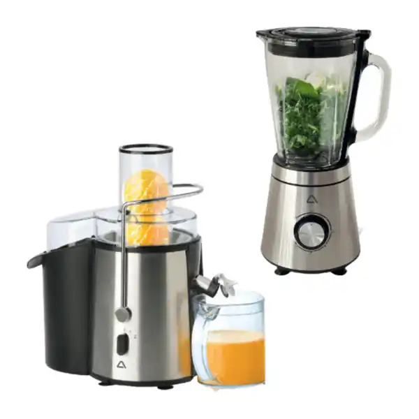 Entsafter JE-380, 850 W, 2 Geschwindigkeiten, geeignet für Obst und Gemüse, Saftbehälter, Volumen: ca. 1 L, oder Standmixer BL-600, 600 W, 5 Geschwindigkeiten, Impulsfunktion, Volumen: ca. 1,5 L