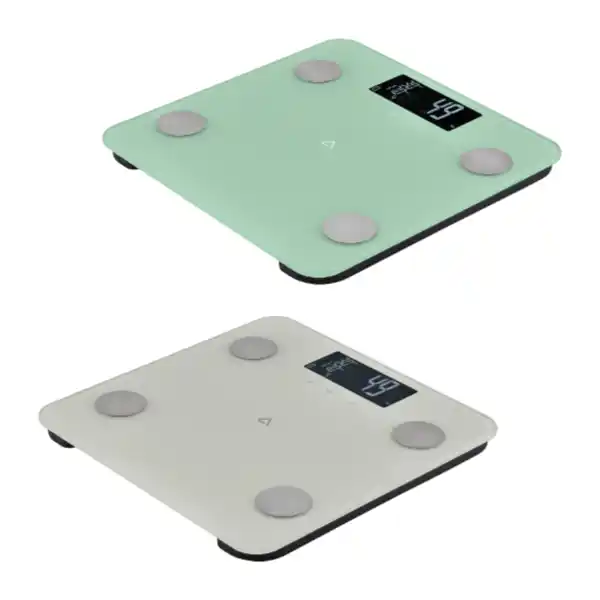 Modell BF25_01484; Glas; LC-Display; misst Gewicht, Körperfett, Körperwasseranteil, Muskel- und Knochenmasse; Speicher für bis zu 12 Personen; verschiedene Farbvarianten