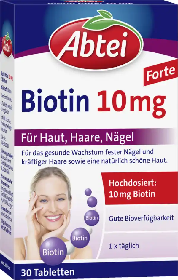 Ursache von brüchigen Nägeln, dünnem Haar und schuppiger Haut kann ein Mangel an Biotin, auch Vitamin H genannt, sein. Durch die Einnahme der hochdosierten Abtei Biotin 10 mg Tabletten wird einem Biotin-Mangel vorgebeugt.