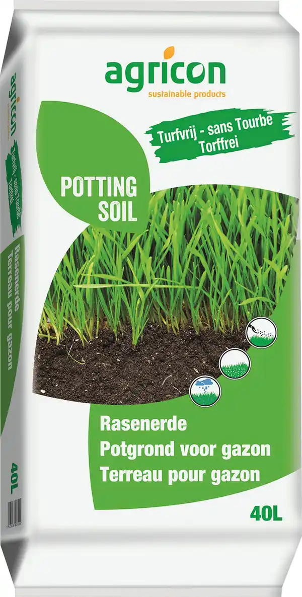 Agricon Rasenerde ist eine torffreie Spezialerde zur Neuanlage und Ausbesserung von Rasenflächen. Das Substrat ist gebrauchsfertig und mit allen wichtigen Nährstoffen angereichert. Zudem wirkt sie bodenverbessernd, vitalisiert das Wurzelwachstum und fördert das Keimen der Samen. Sie sorgt für einen lockeren, fruchtbaren Boden und optimiert die Wasserspeicherung. Der enthaltene Rasensand (hochwertiger Quarzsand) verbessert die Drainage und reduziert die Gefahr von Staunässe.