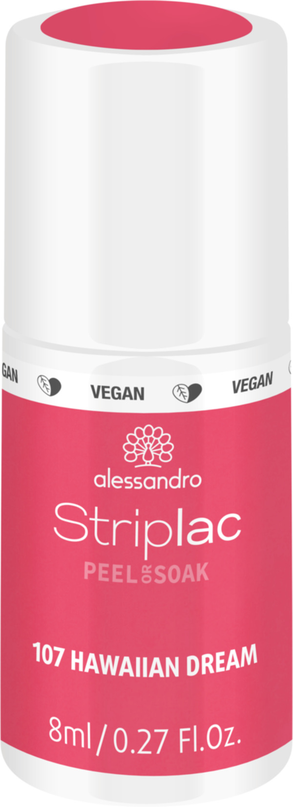 Aloha Das kräftige Rosa des Peel or Soak Striplac in der Farbe Hawaiian Dream erinnert an das Paradies und seine Blütenpracht - für Nägel wie frisch aus dem Urlaub Das Beste– STRIPLAC ist VEGAN und TIERVERSUCHSFREI!Leichtes Auftragen, keine Trocknungszeit und bis zu 3 Wochen Haltbarkeit? Kein Problem. Einfach eine Schicht Hawaiian Dream Striplac auftragen und mit dem Top Coat versiegeln. Dank der Peel or Soak lässt sich der Lack gleich auf zwei Weisen entfernen: Mit dem Peel-Off Aktivator kann der Lack mit Hilfe eines Hufstäbchens in einer Schicht entfernt werden, mit dem Soak-Off Liquid wird dieser mit Hilfe der Folienpads sanft abgelöst. alessandro Striplac - für Nägel, wie frisch aus dem Urlaub in nur 15 Minuten.Produktdetails• Hawaiian Dream Striplac im kräftigen Pink• Bis zu 3 Wochen Haltbarkeit• Keine Trocknungszeit• Schnelle Peel-Off oder Soak-Off Ablösung• Schützt und festigt den Naturnagel • VEGAN und Tierversuchsfrei• Hinweis: Lack trocknet nicht ohne alessandro LED-LampeStriplac Peel or Soak ist das Must-Have für jede Frau, die Wert auf schöne Nägel legt! Nägel wie aus dem Nagelstudio in etwa 15 Minuten! Striplac ist ein einzigartiger Nagellack, der wesentlich länger hält als herkömmlicher Nagellack – bis zu drei Wochen. Hochglanz bis zum letzten Tag! Striplac kann einfach und streifenfrei aufgetragen werden, deckt bereits nach der ersten Anwendung, ist kratz- und splitterfest. Keine lästige Trockenzeit, denn Striplac härtet in 60 Sekunden im LED-Gerät. Das Ergebnis ist eine perfekte UV/LED-Maniküre wie aus dem Nagelstudio. Zum schnellen Ablösen gibt es zwei Möglichkeiten: Schnelle Peel-Off or Soak-Off Lösung. Durch den Peel-Off Aktivator lässt sich der Striplac einfach vom Nagel abziehen oder Sie nutzen die Soak-Off Remover Wraps zum Ablösen. Der Lack ist mit beiden Lösungen rückstandslos zu entfernen.