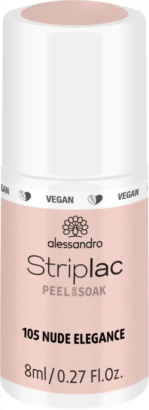 Eleganz pur: Der Peel or Soak Striplac in Nude Elegance veredelt garantiert jeden Look, der halb-transparente Farbton in einem zarten Nudeton sorgt für elegant-glänzende NägelDas Beste– STRIPLAC ist VEGAN und TIERVERSUCHSFREI!Leichtes Auftragen, keine Trocknungszeit und bis zu 3 Wochen Haltbarkeit? Kein Problem. Einfach eine Schicht Nude Elegance Striplac auftragen und mit dem Top Coat versiegeln. Dank der Peel or Soak lässt sich der Lack gleich auf zwei Weisen entfernen: Mit dem Peel-Off Aktivator kann der Lack mit Hilfe eines Hufstäbchens in einer Schicht entfernt werden, mit dem Soak-Off Liquid wird dieser mit Hilfe der Folienpads sanft abgelöst. alessandro Striplac - für elegant-glänzende Nägel in nur 15 Minuten.Produktdetails• Nude Elegance Striplac im zarten Nudeton• Bis zu 3 Wochen Haltbarkeit• Keine Trocknungszeit• Schnelle Peel-Off oder Soak-Off Ablösung• Schützt und festigt den Naturnagel • VEGAN und Tierversuchsfrei• Hinweis: Lack trocknet nicht ohne alessandro LED-LampeStriplac Peel or Soak ist das Must-Have für jede Frau, die Wert auf schöne Nägel legt! Nägel wie aus dem Nagelstudio in etwa 15 Minuten! Striplac ist ein einzigartiger Nagellack, der wesentlich länger hält als herkömmlicher Nagellack – bis zu drei Wochen. Hochglanz bis zum letzten Tag! Striplac kann einfach und streifenfrei aufgetragen werden, deckt bereits nach der ersten Anwendung, ist kratz- und splitterfest. Keine lästige Trockenzeit, denn Striplac härtet in 60 Sekunden im LED-Gerät. Das Ergebnis ist eine perfekte UV/LED-Maniküre wie aus dem Nagelstudio. Zum schnellen Ablösen gibt es zwei Möglichkeiten: Schnelle Peel-Off or Soak-Off Lösung. Durch den Peel-Off Aktivator lässt sich der Striplac einfach vom Nagel abziehen oder Sie nutzen die Soak-Off Remover Wraps zum Ablösen. Der Lack ist mit beiden Lösungen rückstandslos zu entfernen.