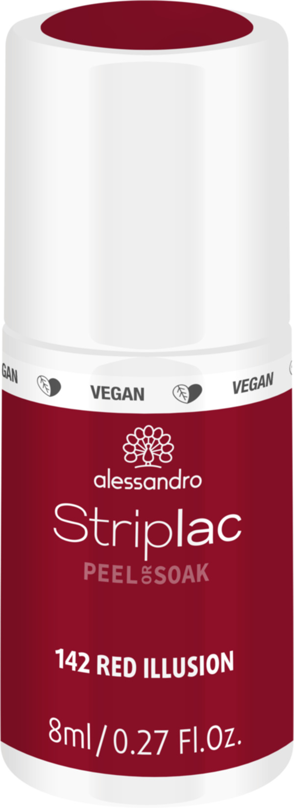 Dieser satte Rotton ist der beste Beweis dafür, dass uns eine Nuance auf den ersten Blick verzaubern und in eine andere Welt entführen kannDas Beste– STRIPLAC ist VEGAN und TIERVERSUCHSFREI!Leichtes Auftragen, keine Trocknungszeit und bis zu 3 Wochen Haltbarkeit? Kein Problem! Einfach eine Schicht Red Illusion Striplac auftragen und mit dem Top Coat versiegeln. Dank der Peel or Soak Innovation lässt sich der Lack gleich auf zwei Weisen entfernen: Mit dem Peel-Off Aktivator kann der Lack mit Hilfe eines Hufstäbchens in einer Schicht entfernt werden, mit dem Soak-Off Liquid wird dieser mit Hilfe der Folienpads sanft abgelöst. alessandro Striplac - für wunderschön-funkelnde Nägel in nur 15 Minuten!Produktdetails• Red Illusion Striplac im satten Rotton• Bis zu 3 Wochen Haltbarkeit• Keine Trocknungszeit• Schnelle Peel-Off oder Soak-Off Ablösung• Schützt und festigt den Naturnagel• VEGAN und Tierversuchsfrei• Hinweis: Lack trocknet nicht ohne alessandro LED-LampeSchluss mit lästiger Trocknungszeit: Farblack auftragen, 60 Sekunden unter LED aushärten, mit dem Top Coat versiegeln und weitere 90 Sekunden unter LED trocknen - für ideale Nägel in 15 MinutenStriplac Peel or Soak ist das Must-Have für jede Frau, die Wert auf schöne Nägel legt! Nägel wie aus dem Nagelstudio in etwa 15 Minuten! Striplac ist ein einzigartiger Nagellack, der wesentlich länger hält als herkömmlicher Nagellack – bis zu drei Wochen. Hochglanz bis zum letzten Tag! Striplac kann einfach und streifenfrei aufgetragen werden, deckt bereits nach der ersten Anwendung, ist kratz- und splitterfest. Keine lästige Trockenzeit, denn Striplac härtet in 60 Sekunden im LED-Gerät. Das Ergebnis ist eine perfekte UV/LED-Maniküre wie aus dem Nagelstudio. Das Beste– STRIPLAC ist VEGAN und TIERVERSUCHSFREI! Zum schnellen Ablösen gibt es zwei Möglichkeiten: Schnelle Peel-Off or Soak-Off Lösung. Durch den Peel-Off Aktivator lässt sich der Striplac einfach vom Nagel abziehen oder Sie nutzen die Soak-Off Remover Wraps zum Ablösen. Der Lack ist mit beiden Lösungen rückstandslos zu entfernen.