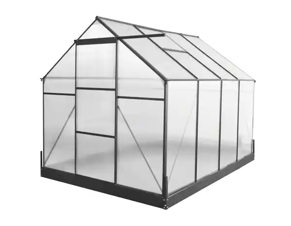 Green Yard Aluminium Gewächshaus mit Dachfenster "Hanoi" , ca. 250 x 190 x 207 cm - Silber Das Green Yard Aluminium-Gewächshaus bietet Hobbygärtnern die perfekte Umgebung Der stabile, rostfreie Aluminiumrahmen macht das Gewächshaus besonders langlebig und widerstandsfähig gegenüber Wind und Wetter Pflegeleichte Materialien und die durchdachte Konstruktion Durch die lichtdurchlässigen, robusten Paneele gelangt reichlich Sonnenlicht ins Innere Das integrierte Dachfenster schafft eine natürliche Belüftung und sorgt jederzeit für ein optimales Klima im Inneren Mit seinen kompakten Maßen nutzt das „Hanoi“ den vorhandenen Platz effizient und passt perfekt in jeden Garten Maße Ca. 4,8 m² Ca. 250 x 190 x 207 cm Wandhöhe: Ca. 133 cm Größe Tür: Ca 59 x 176cmTechnische Daten ca. 1,2 mm Aluminium Rahmen mit Pulverbeschichtung ca. 0,6 mm starker verzinkter Stahl mit Pulverbeschichtung ca. 4 mm dicke Polycarbonatplatten mit UV-Schutz keine Klammern erforderlich Eine Schiebetür und 1 verstellbare Dachlüftung Regenrinnen inklusiveFarbe SilberLieferumfang 1x Green Yard Aluminium Gewächshaus mit Dachfenster "Hanoi" , ca. 250 x 190 x 207 cm - Silber 4x Wasserauslässen Vollständige Dach- und Wandstützen enthalten 4x Verankerungen für bessere Wundbeständigkeit 1x Fundament Keywords: Aluminium Gewächshaus, Pflanzenhaus, Gewächshaus, Silber, Crystal Plus, Anbauschuppen