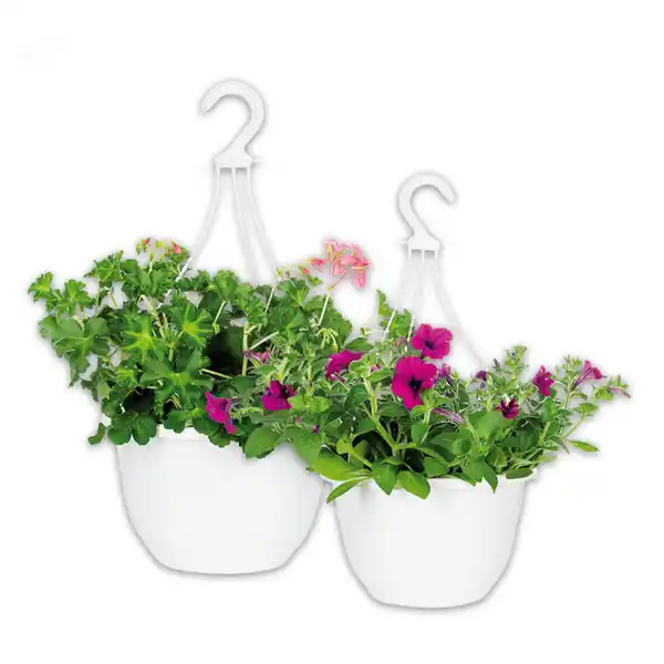 - in den Sorten z.B.: Bidens, Minipetunie, Fuchsien hängend, Geranien hängend, Hängepetunien, Verbenen, Sanvitalia, Scaevola oder Lobelia