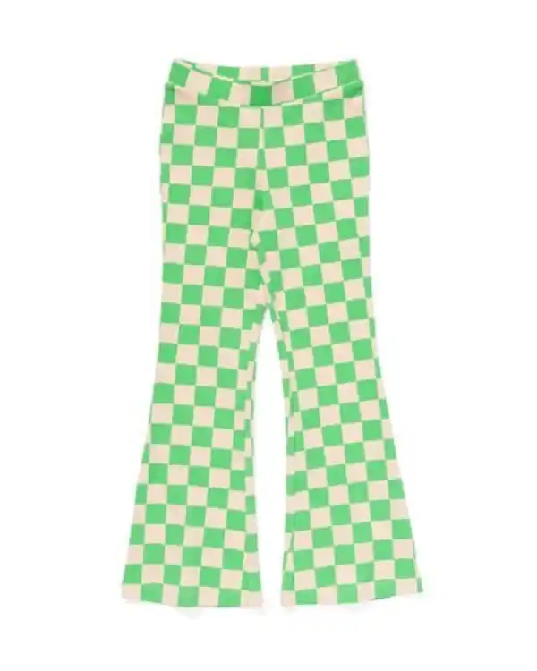 Diese Kinderleggings bestehen aus strapazierfähigem Baumwollstretch mit Rippenstruktur. Die ausgestellten Leggings haben einen Gummibund und ein weites, ab den Knien abgehendes Bein. Die Hose ist grün mit weißem Blockmuster. Dieses ausgestellte Leggingsmodell lässt sich super mit einer Bluse oder einem T-Shirt, aber auch toll mit einem großen Pullover kombinieren.