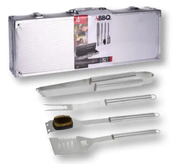 4-teilig, aus Edelstahl ,im Aluminiumkoffer beinhaltet: 1 Grillzange, 1 Wender, 1 Grillgabel und 1 Grillbürste