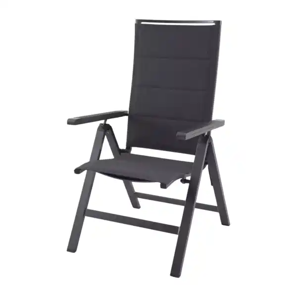 Gestell Aluminium; strapazierfähiger textiler Bezug; 7-fach verstellbare Rückenlehne; ca. 11 mm extrastarke Polsterung