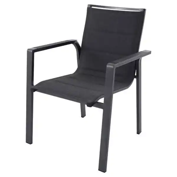 \n- Je Stück - Moderne Kopfstütze in den Rahmen integriert - Polywood-Armlehne in Schwarz, Holzoptik - Auch ohne Kissen bequemes Sitzen dank ca. 11 mm extra dicker Polsterung. Leicht zu reinigen. - Hochwertiger, stabiler, aber dennoch leichter Aluminiumrahmen - Platzsparend und einfach stapelbar - Maximale Tragfähigkeit 150 kg - Für den privaten Außeneinsatz
