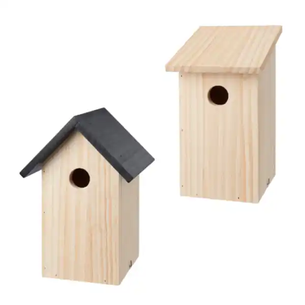 Holz; mit Einflugloch; seitliche Klapptür für die Reinigung; verschiedene Modelle und Farbvarianten