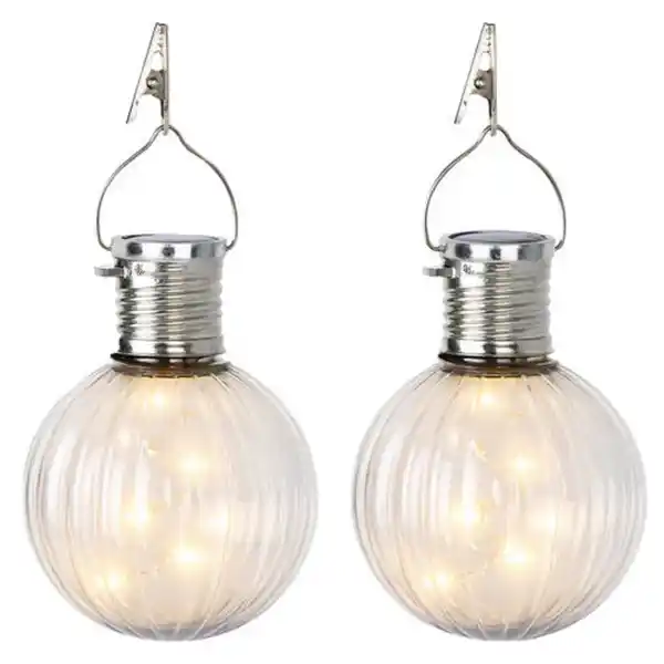 \n- Je 2er-Pack - Dekorative Lichter als Set von 2 in verschiedenen Farben mit gewellter Kugelform oder glatter Glühbirne mit Solar - Glühbirne: Ø 7,5 x 19,5 cm - Kugel: Ø 8 x 15 cm - 5 Stück warmweiße Micro-LED-Lichtkette - 1,2V 60mAh Ni Mh wiederaufladbare Batterie - mit Aufhängungsöse + Clip - IP44 spritzwasserdicht - Leuchtdauer: ca. 6 Stunden - Ladezeit: maximal 8 Stunden