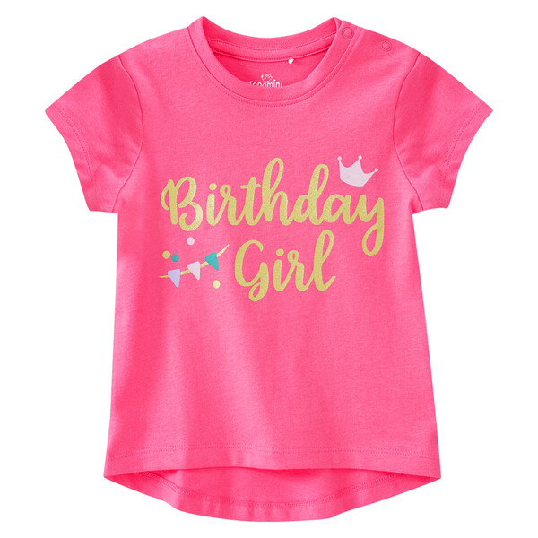 Die wichtigste Person des Tages! Pinkes T-Shirt aus angenehmer Baumwolle mit gold glänzendem Schriftzug "Birthday Girl" bedruckt. Rundhalsausschnitt mit schmalem Bündchen und Schulterknöpfung linksseitig. Leicht ausgestellt und hinten mit abgerundetem, verlängertem Saum. Cotton made in Africa setzt sich für einen ökonomisch, sozial und ökologisch nachhaltigeren Baumwollanbau in Subsahara-Afrika ein und trägt damit zu einer Verbesserung der Lebensbedingungen kleinbäuerlicher Familien bei.
