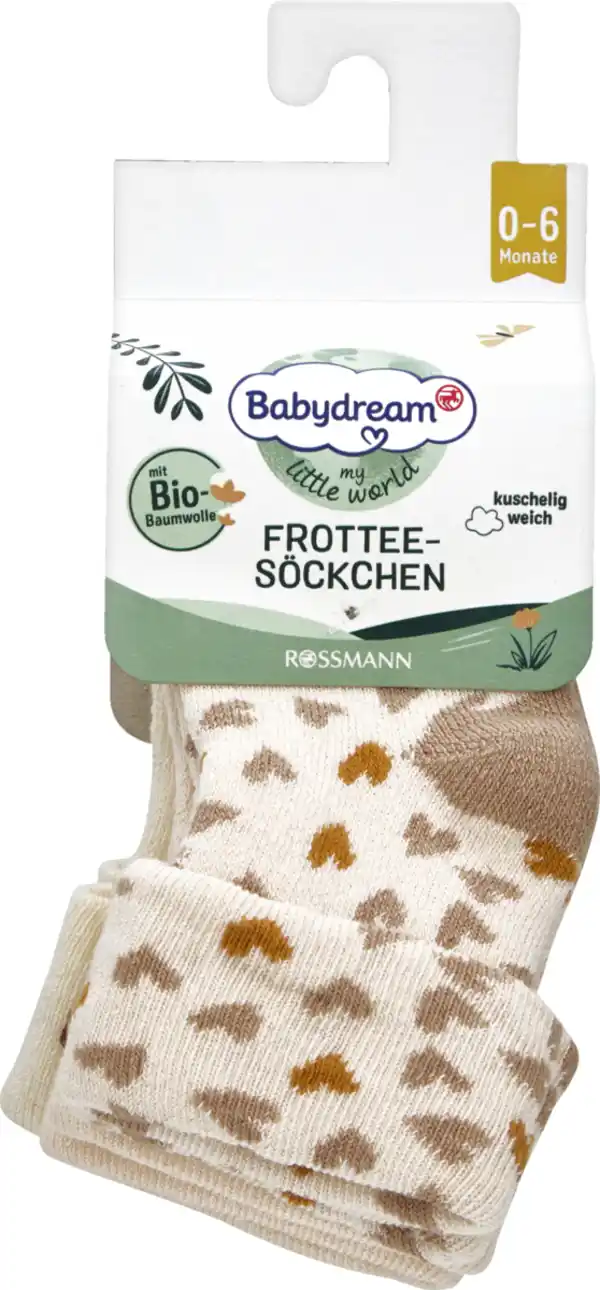 Frotteesöckchen, 0-6 MonateUnsere Babydream Frotteesöckchen haben eine kuschelig weiche Innenseite. Um Ihrem Baby einen hohen Tragekomfort zu bieten, haben wir viel Wert auf eine angenehme Passform gelegt. Mit ihrem hohen Bio-Baumwollanteil sind die Frotteesöckchen besonders hautfreundlich. Sie erhalten unsere Söckchen auch in der Größe 6-12 Monate.3 Paar