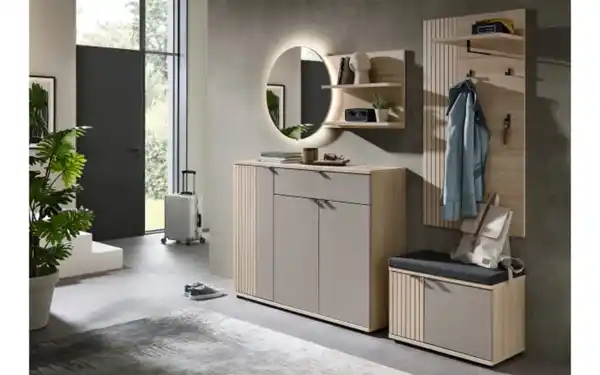 Moderne Garderobenkombination aus der Serie Pisa mit Korpus aus Riva Eiche-Nachbildung, Front mit Leisten, Absetzung in Basalt,