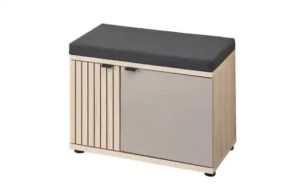 Moderner Solobank aus der Serie Pisa mit Korpus aus Riva Eiche-Nachbildung, Front mit Leisten und Absetzung in Basalt, 2 Türen, 2 Fachböden,