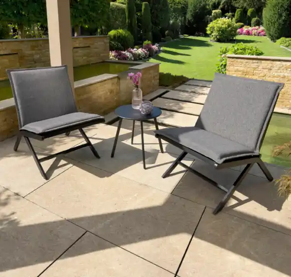 3-teilig: 2 Stühle: je ca. 60 x 75,5 x 81 cm und Tisch: ca. 46 x 38 cm, Stahlgestell, pulverbeschichtet, inkl. Sitz- und Rückenkissen aus Polyester (Alle Angaben in B x H x T bzw. Ø x H) (o. Deko)