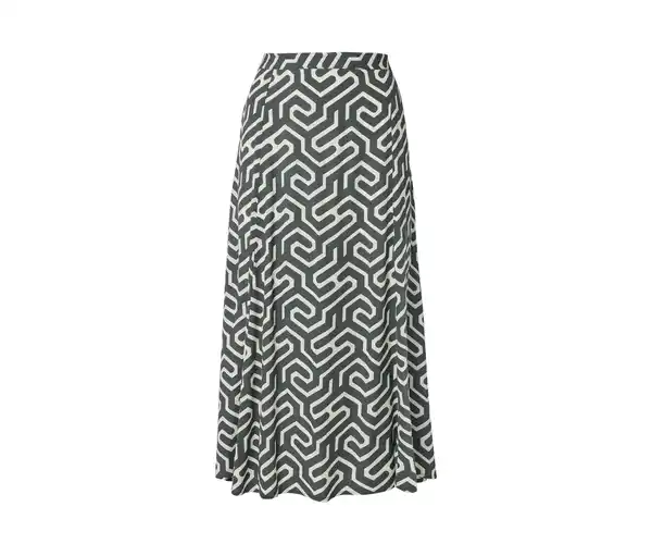 Bedruckter Midi-Rock Farbe: Dunkelgrün mit cremefarbenem Alloverprint Material: 100% Viskose Maße: Gesamtlänge ca. 82,5 cm (Gr. 40) Passform: Regular Fit Leicht gekreppte Webqualität aus reiner ViskoseRückwärtig elastischer BundLeichte A-LinieTeilungsnähte auf Vorder- und RückseiteModerner graphischer Print