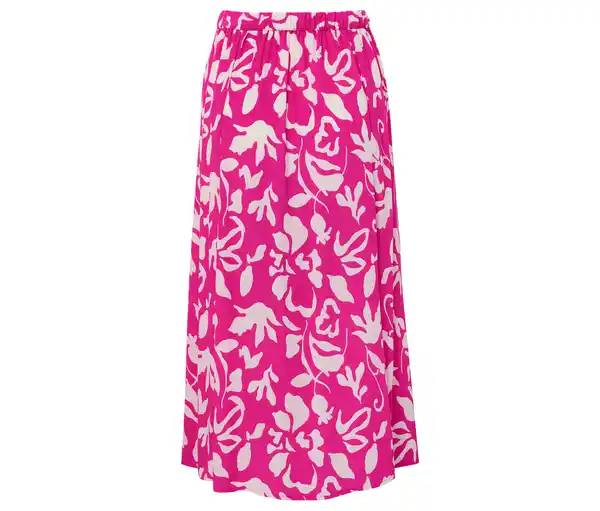 Bedruckter Midi-Rock Farbe: Pink mit weißem Alloverprint Material: 100% Viskose Maße: Gesamtlänge ca. 81,7 cm (Gr. 40) Passform: Regular Fit Leicht gekreppte Webqualität aus reiner ViskoseElastischer Bund auf der RückseiteLeichte A-LinieTeilungsnähte auf Vorder- und Rückseite