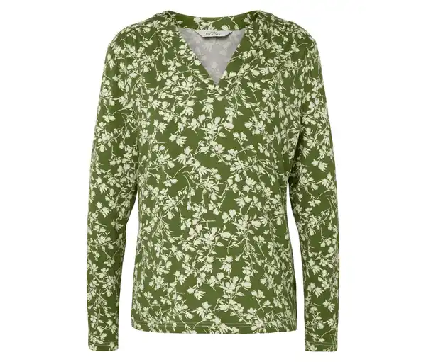Bedrucktes Blusenshirt Farbe: Grün mit weißem Alloverprint Material: 95% Viskose, 5% Elasthan (Creora®) Maße: Gesamtlänge ca. 66,5 cm (Gr. M 40/42) Passform: Regular Fit Weich fließende Viskose-Stretch-QualitätRundhals mit V-AusschnittVorverlegte Schulternähte mit leichter RaffungMit Elasthan: formbeständig, perfekter Sitz, hoher TragekomfortDieses Blusenshirt beinhaltet Fasern aus nachhaltigem Holz.