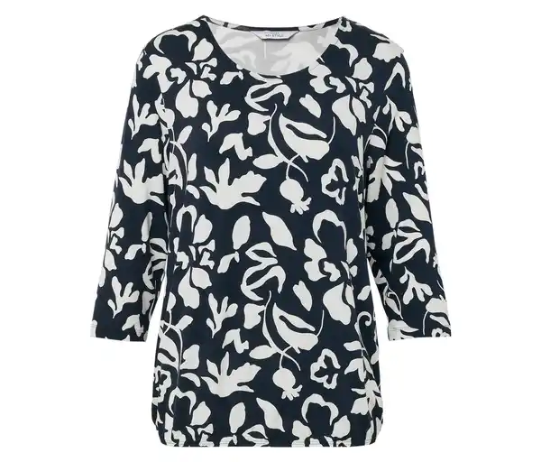 Bedrucktes Blusenshirt, dunkelblau-weißer Alloverprint Farbe: Dunkelblau-weißer Alloverprint Material: 95% Viskose, 5% Elasthan (Creora®) Maße: Gesamtlänge ca. 66,5 cm (Gr. M 40/42) Passform: Regular Fit Weich fließende Viskose-Stretch-QualitätElastischer Saum für eine optimale Passform3/4-ArmRundhalsausschnittSommerlicher AlloverprintMit Elasthan: formbeständig, perfekter Sitz, hoher Tragekomfort