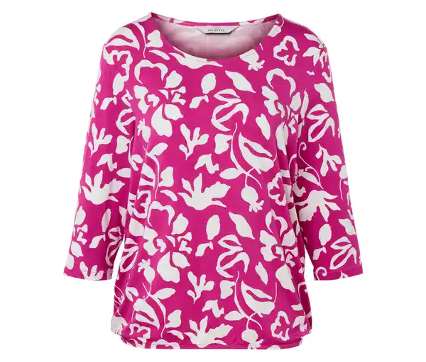 Bedrucktes Blusenshirt, pink-weißer Alloverprint Farbe: Pink-weißer Alloverprint Material: 95% Viskose, 5% Elasthan (Creora®) Maße: Gesamtlänge ca. 66,5 cm (Gr. M 40/42) Passform: Regular Fit Weich fließende Viskose-Stretch-QualitätElastischer Saum für eine optimale Passform3/4-ArmRundhalsausschnittSommerlicher AlloverprintMit Elasthan: formbeständig, perfekter Sitz, hoher Tragekomfort