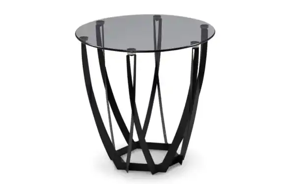 Ausführung der Tischplatte aus grauem Sicherheitsglas, formschönes Gestell aus Metall in schwarz. Durchmesser ca. 50 cm. Höhe ca. 50 cm.