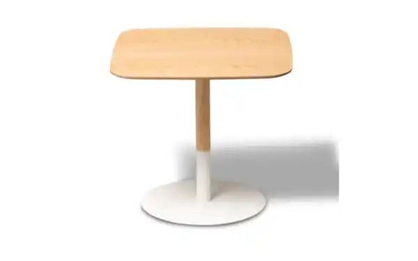 Ausführung der Tischplatte in naturfarben, Eiche furniert, Bodenplatte aus Metall in weiß,