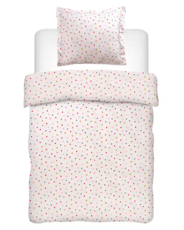 Dieses beige Bettwäscheset mit Herzchenmuster besteht aus einem Bezug und einem passenden Kissenbezug. Das Set hat eine Größe von 135 mal 200 Zentimetern. Das gewebte Material macht den Bezug robust und angenehm im Gebrauch, sodass du gut schlafen kannst. Durch die Kombination mehrerer Farben bekommt dein Schlafzimmer einen fröhlichen Eindruck.